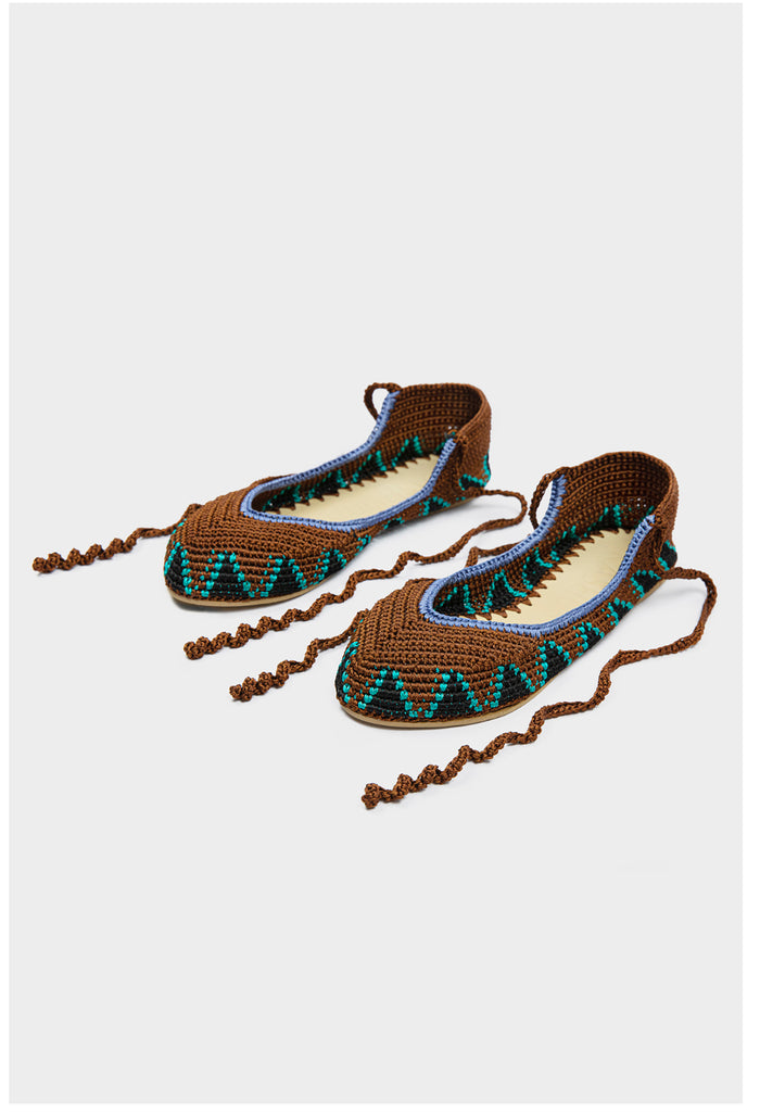 Our almond brown ballerina is crocheted by hand in India. Its fiber is 60% viscose and 40% cotton, the insole is made of calfskin and the sole of rubber. The ballerina is unlined and closed by two side laces. The heel height is 5 mm. Our ballerina fits true to size.