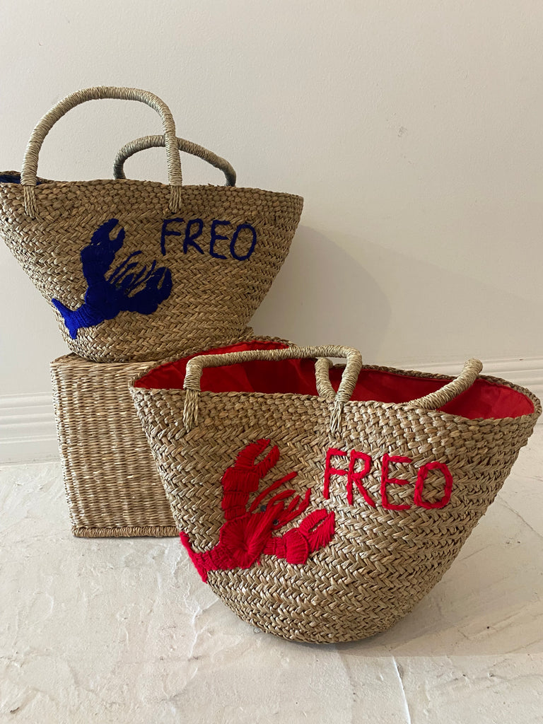 A stunning embroidered lobster adorns our cute  Freo basket, featuring a matching blue drawstring lining for a touch of elegance. Perfect for the holidays or a day at the beach, this basket is ideal for storing your beach essentials while you go for a refreshing swim.