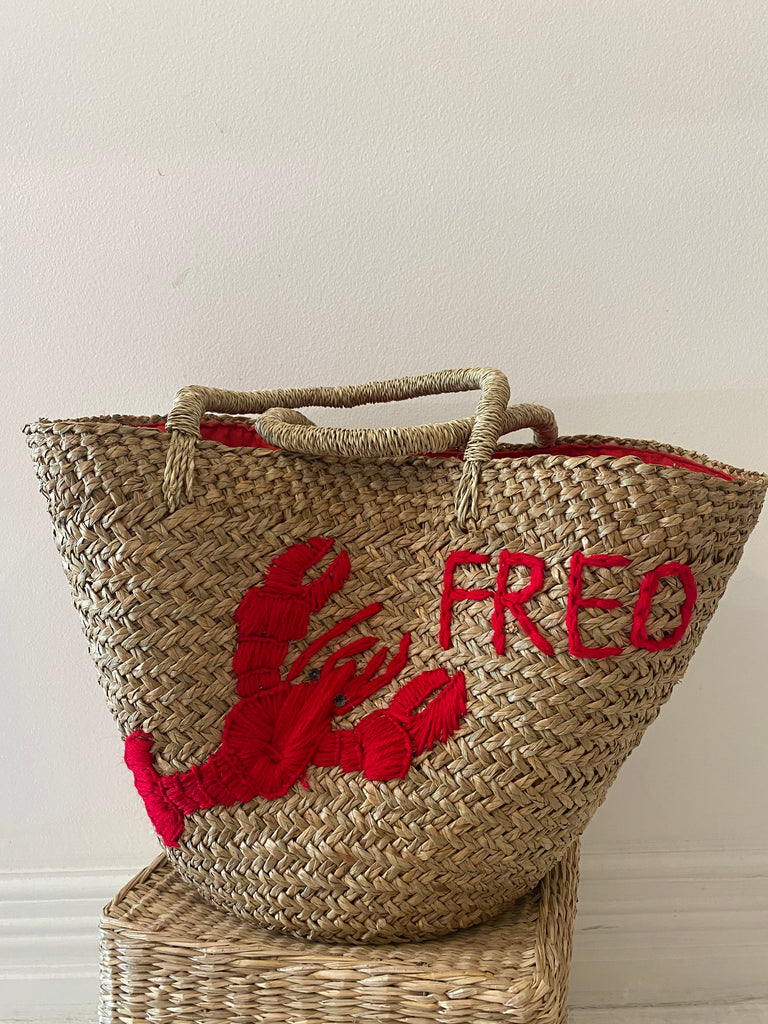 A stunning embroidered lobster adorns our cute Freo basket, featuring a matching red drawstring lining for a touch of elegance. Perfect for the holidays or a day at the beach, this basket is ideal for storing your beach essentials while you go for a refreshing swim.