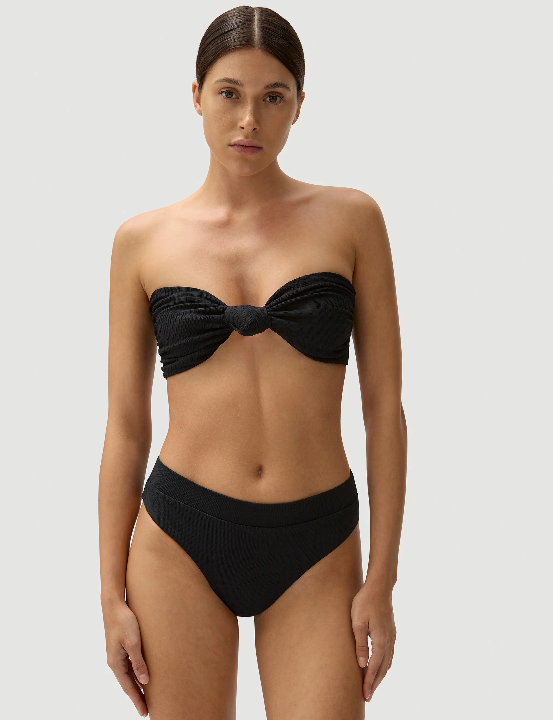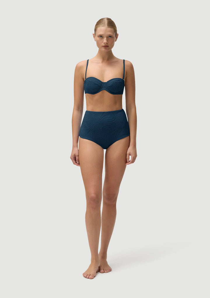 High waisted bottom. High cut in the leg but conservative in the bottom.