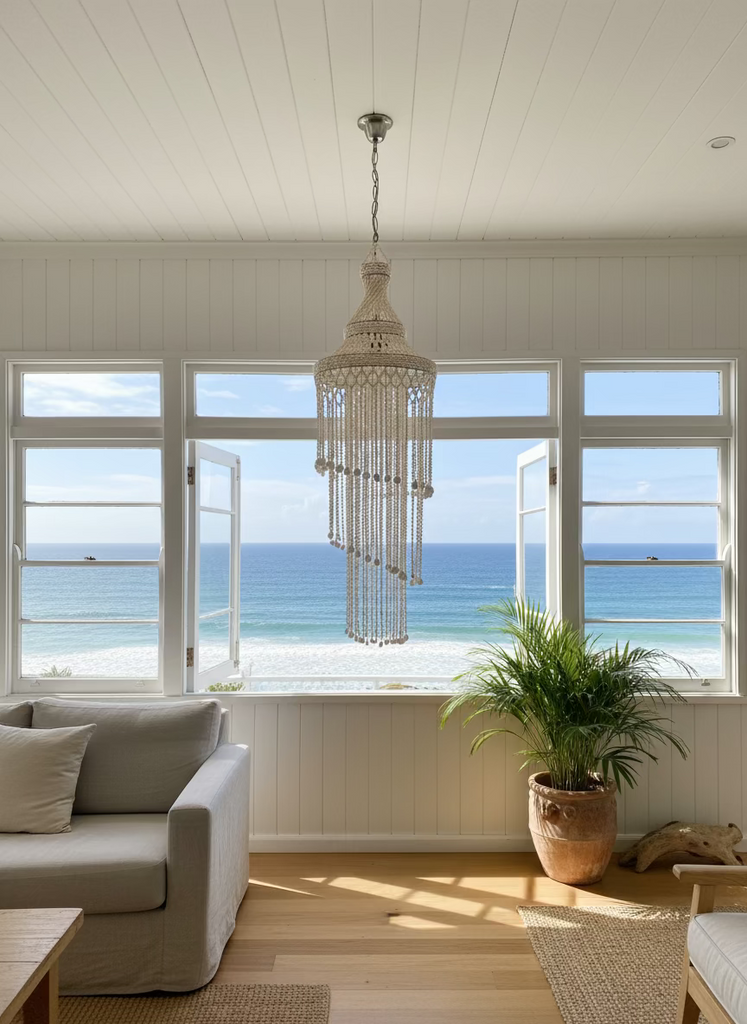 A truly exceptional piece, these chandeliers are hand made using hundreds of tiny creamy shells twined together on a wrought iron base.