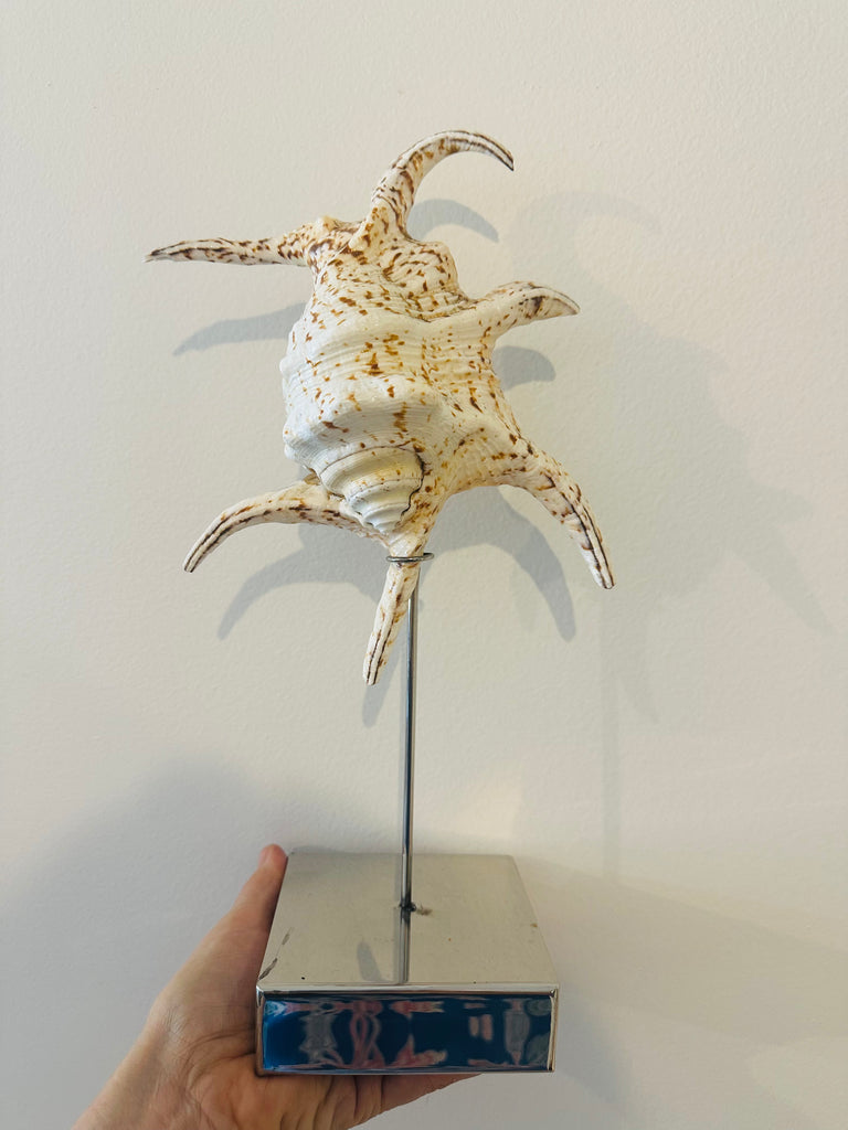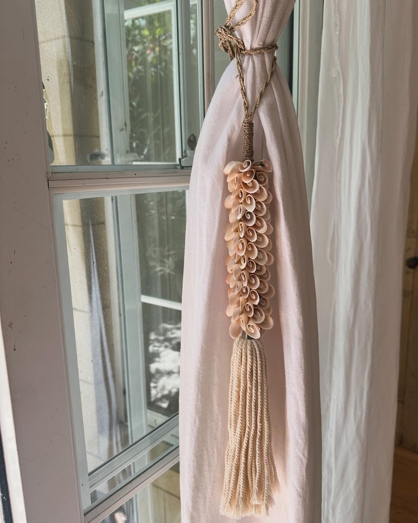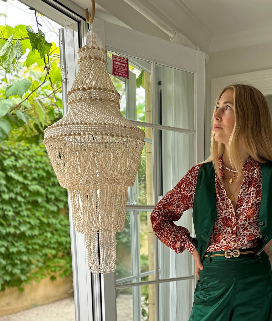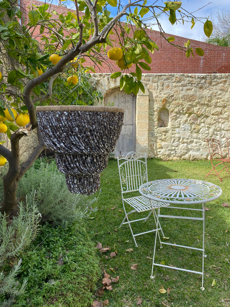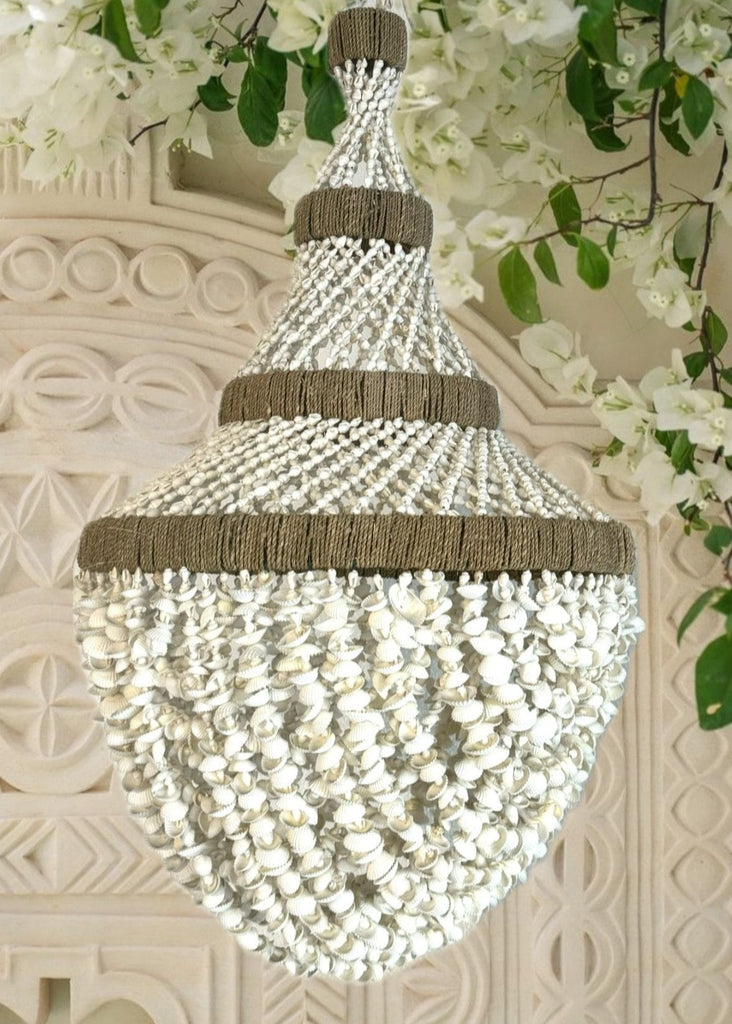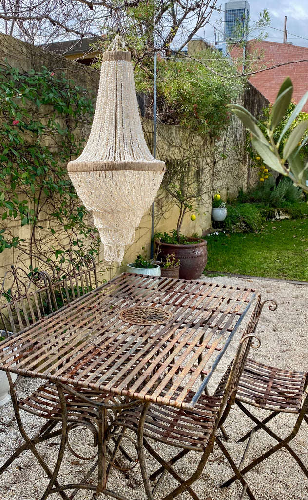A truly exceptional piece, these chandeliers are hand made using hundreds of tiny creamy shells twined together on a wrought iron base.